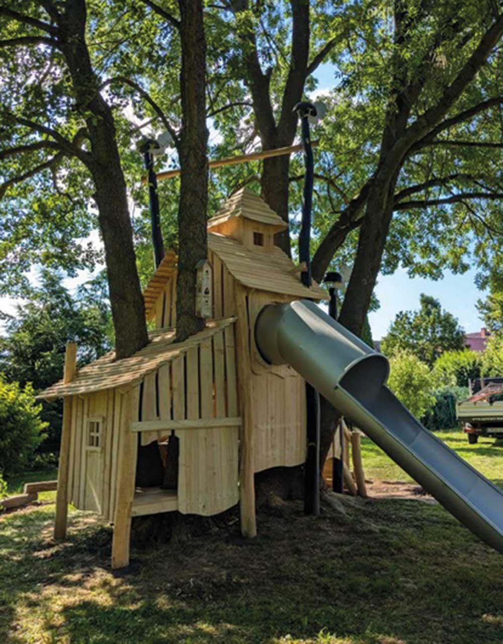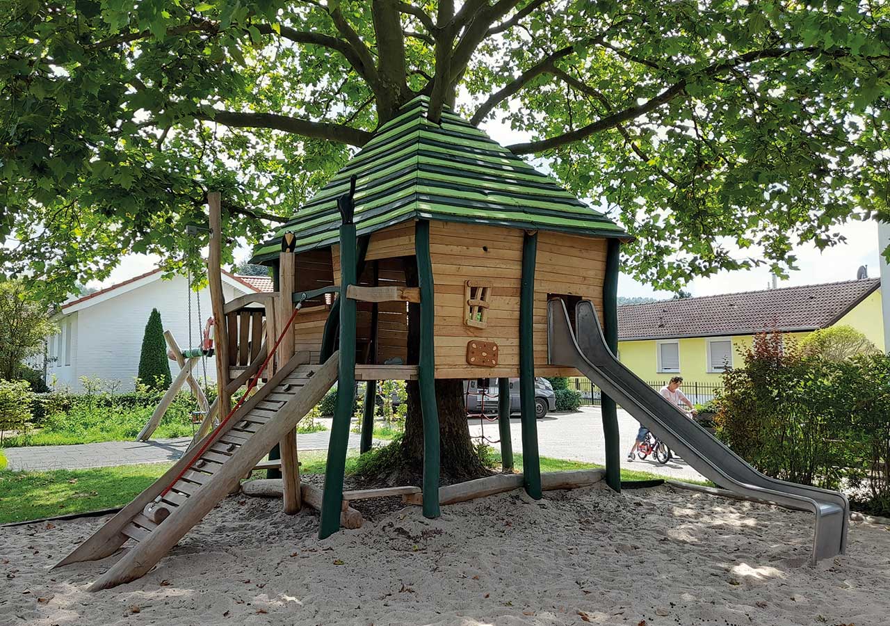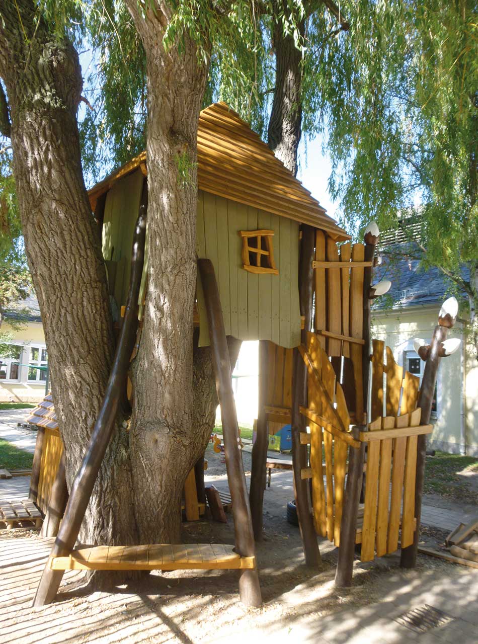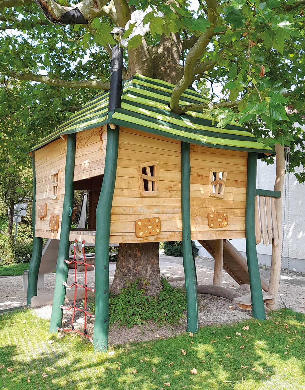 Und wenn kein geeigneter Baum vorhanden ist, können Baumkronenhäuser als abenteuerliche Spielgeräte die Atmosphäre eines Baumwipfels schaffen.