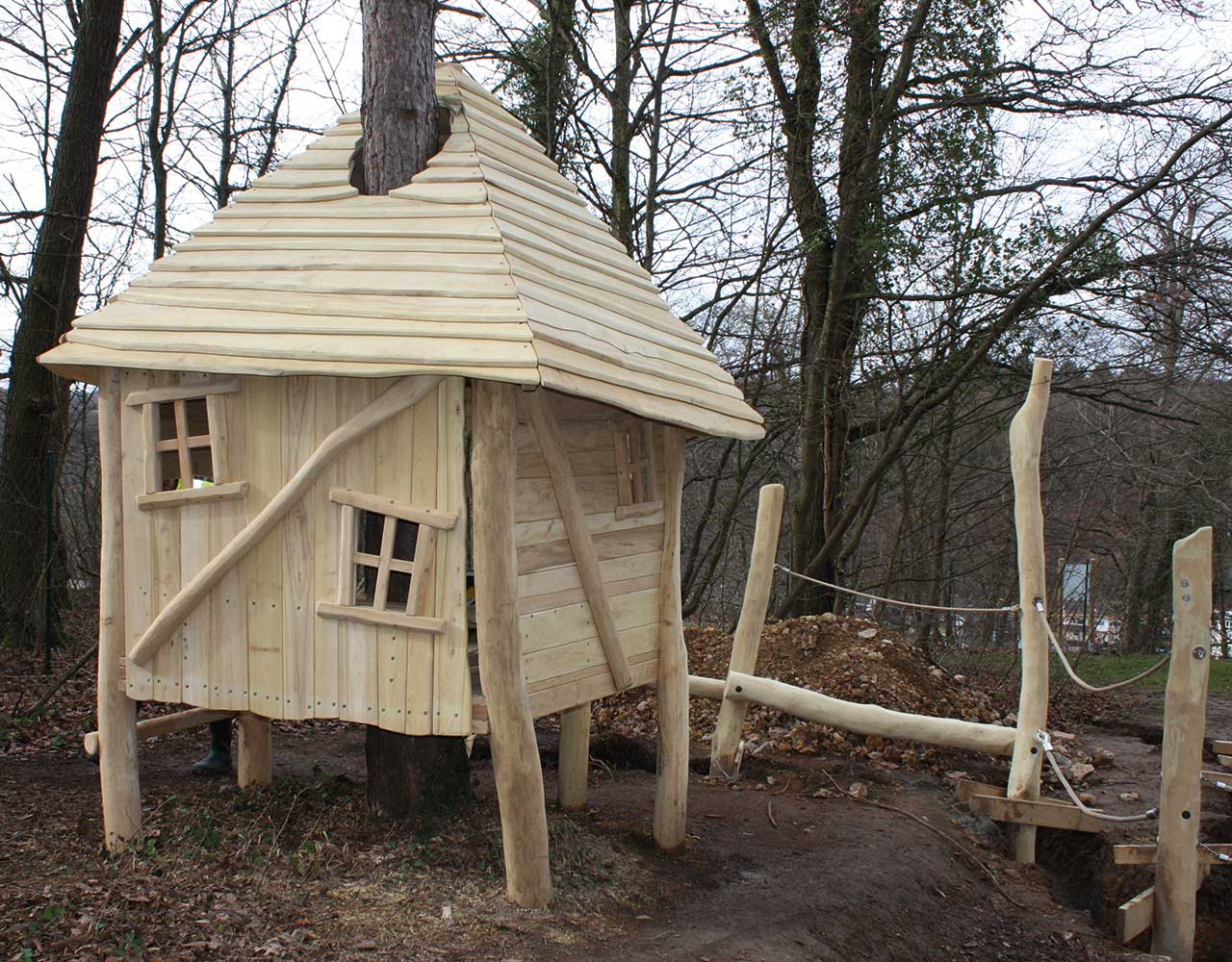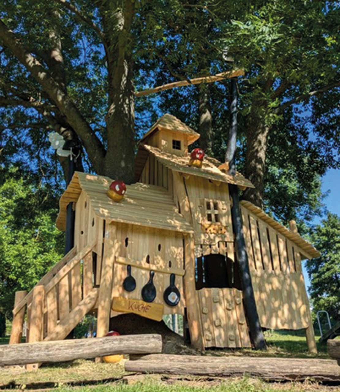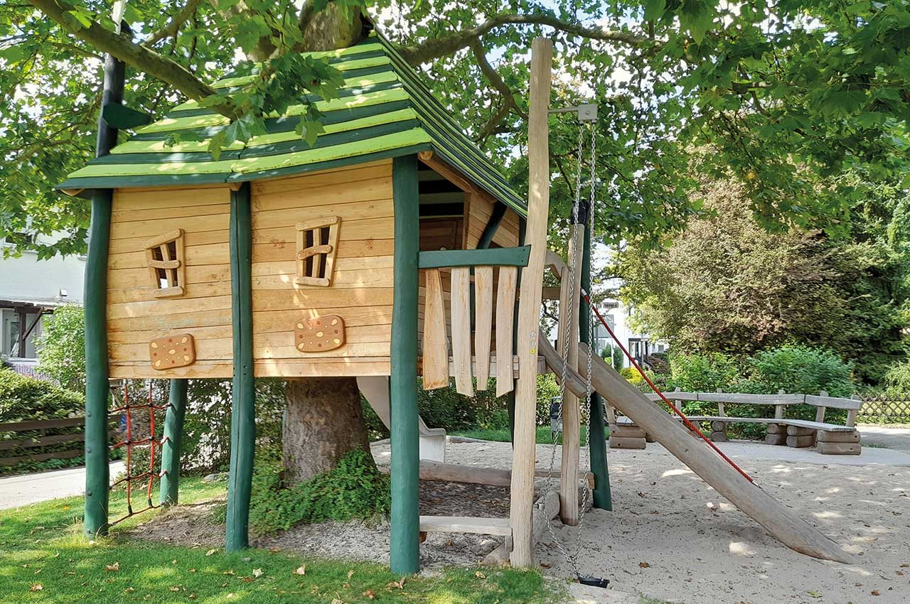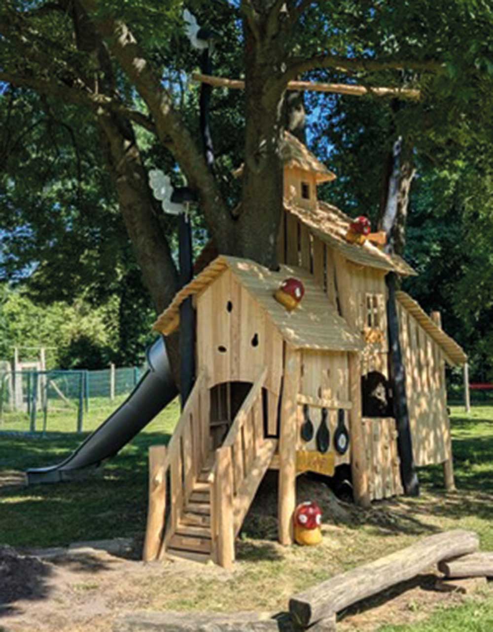Und wenn kein geeigneter Baum vorhanden ist, können Baumkronenhäuser als abenteuerliche Spielgeräte die Atmosphäre eines Baumwipfels schaffen.