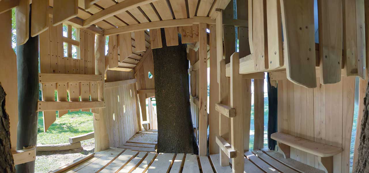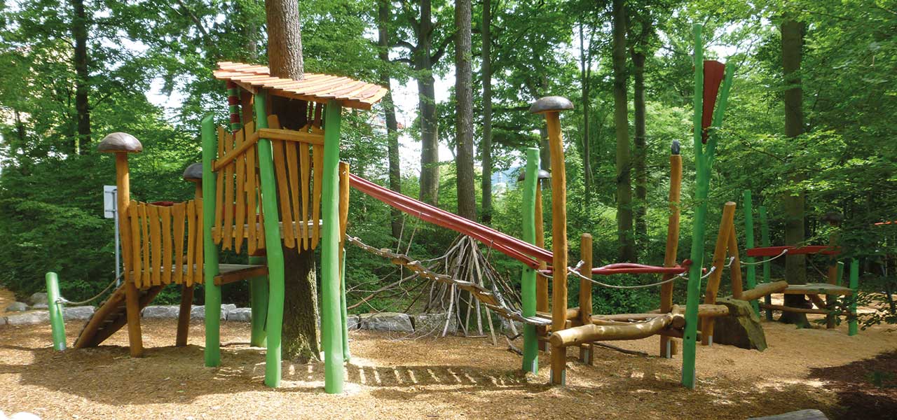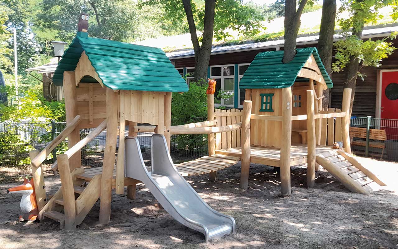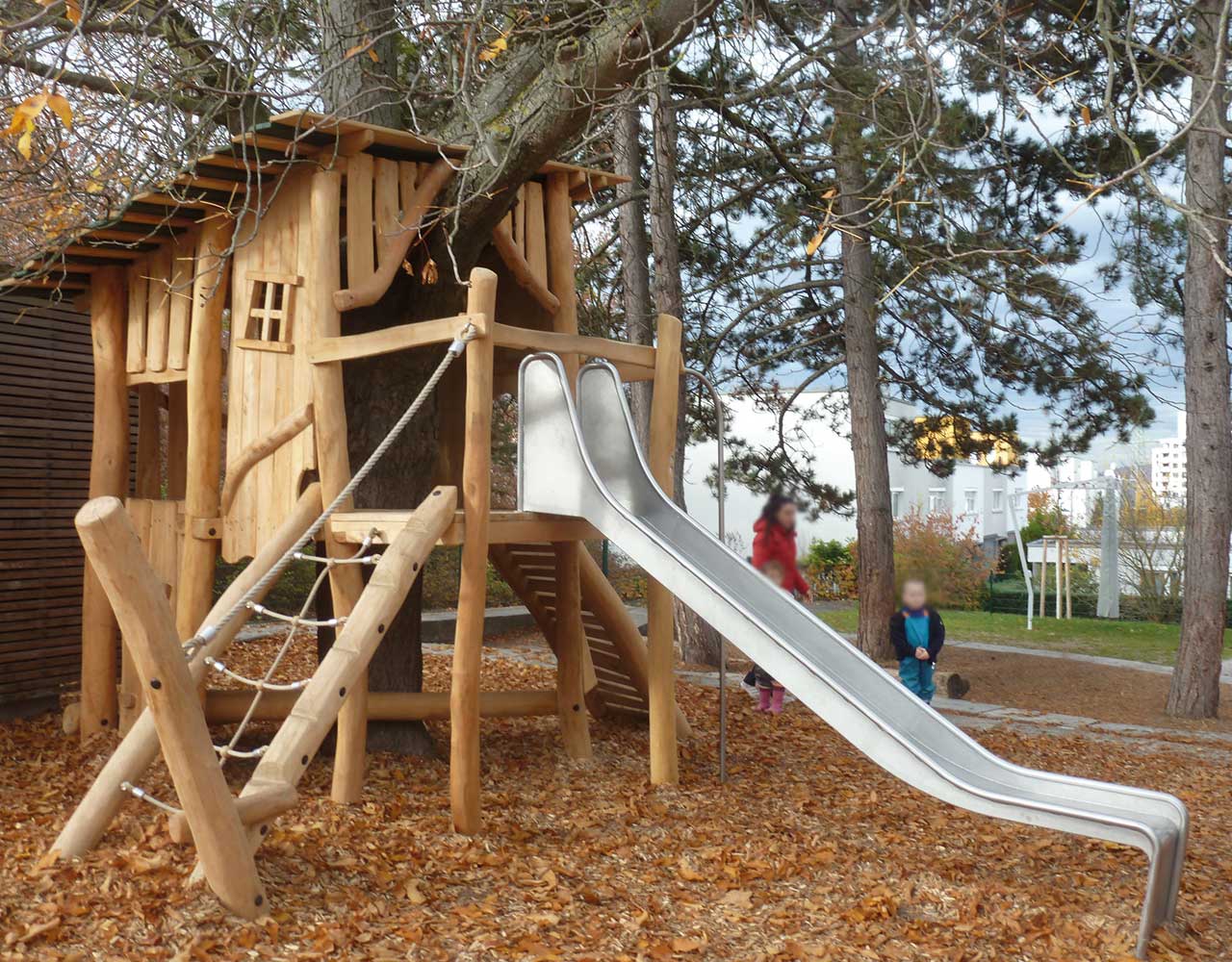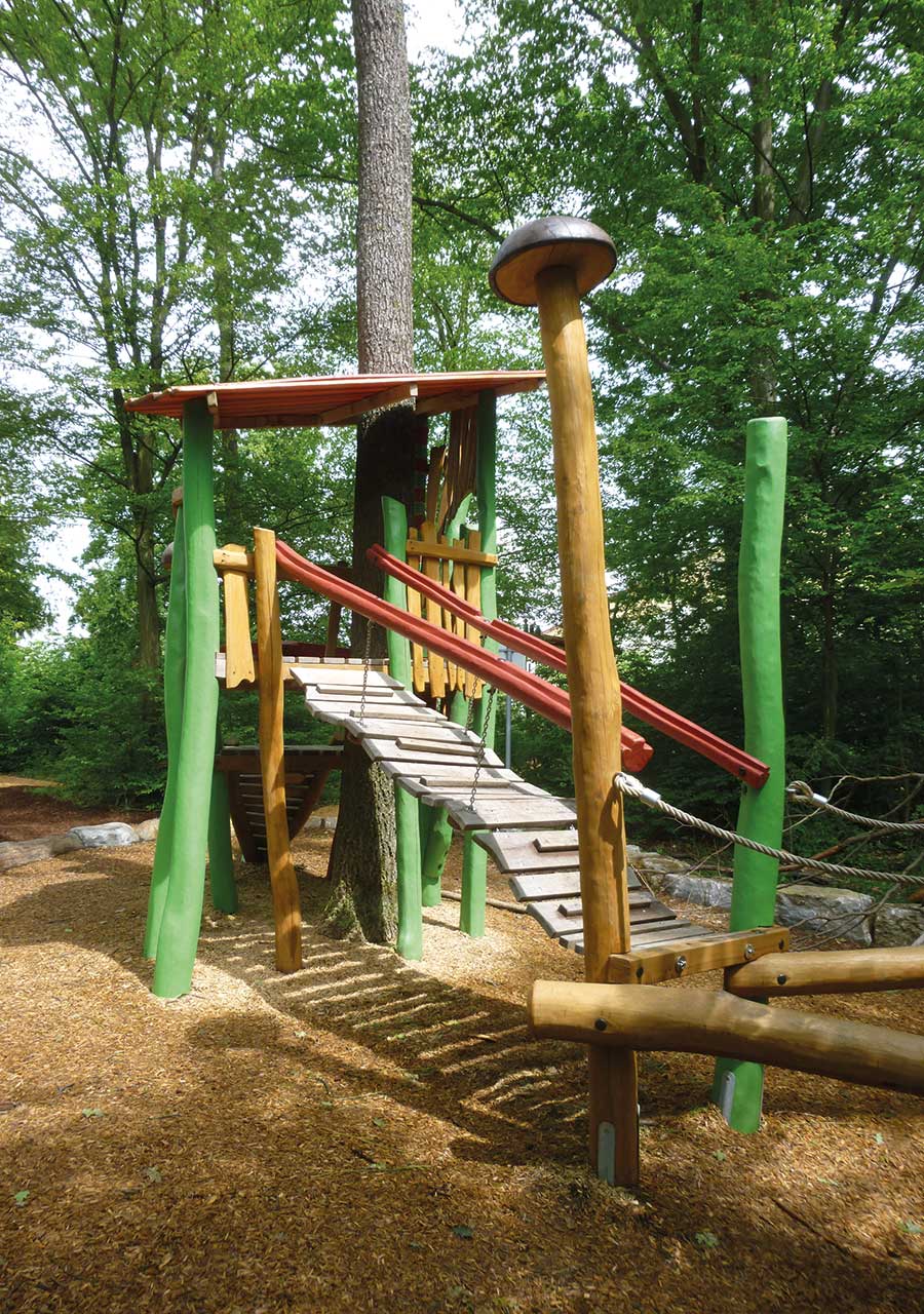 Und wenn kein geeigneter Baum vorhanden ist, können Baumkronenhäuser als abenteuerliche Spielgeräte die Atmosphäre eines Baumwipfels schaffen.
